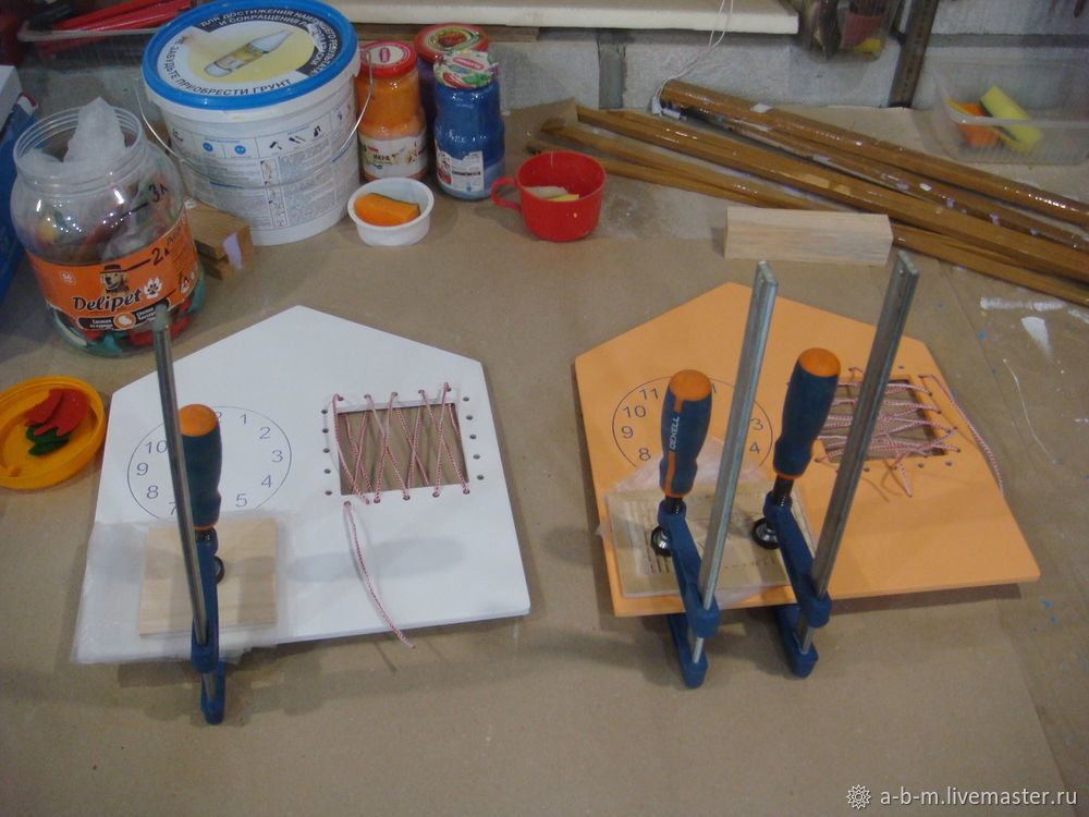 Каркас должен иметь толщину 1 см и более. Нужен молоток, отвертка и ножницы, дрель, малярная кисть. Подобрать соответствующие толщине матрицы гвозди и шурупы. При изготовлении отверстий для крепежных деталей, таких как нити или шнуры, не забудьте шлифовать также края этих отверстий, так как они часто острые.