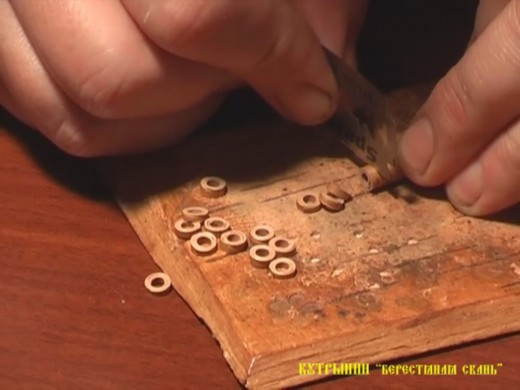 13. Сушим их в тёплам месте дня 3-4. На батарее обогрева, скажем. Или на котле, как я. После чего пробуем на готовность. Сжимаем в пальцах. О, крепкая… Готова значит. А (досадно), мнётся… Посохни-ка ещё денёк, голубушка. И начинаем нарезку на кольца. Лезвие оптимально «Спутник» по качеству и по цене (не реклама). Будьте осторожны, можно порезаться. Ширина, или как кому удобнее, толщина кольца 1,5-2 мм. Берём подложку, у меня из склеенной бересты, и на ней режем, сначала на весу, чтобы лезвие меньше тупилось. А потом на плоскости. Режем пяточкой. Движение от себя. Затупилась пяточка, перевернули лезвие и опять режем. Четыре пяточки у лезвия, это Вам для общего развития. Опять же- экономия. При нарезке трубка должна быть ориентирована так; наружный конец направлен от Вас, чтобы при нарезке не задирался. (Сложно, однако, объяснить на словах. Эх, где моё видео…)